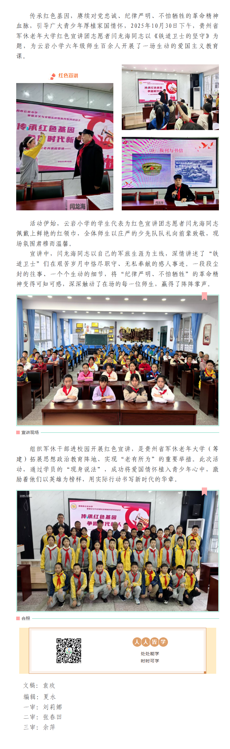 传承红色基因 争做时代新人——贵州省军休老年大学(筹建)红色宣讲团走进云岩小学