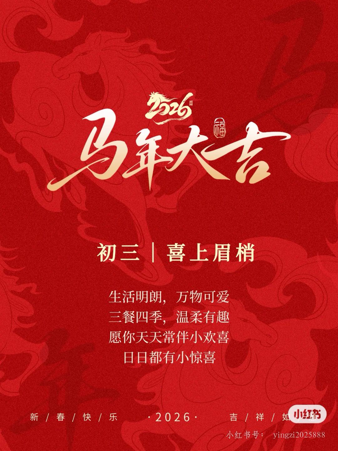 初三启泰,丙午新岁。借马之势,驱旧尘埃。三餐温暖,三生顺遂。家门常启,福运长留。